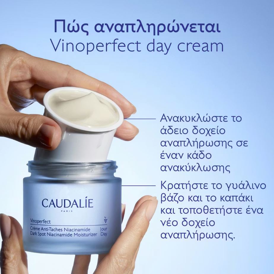 Η Caudalie αναλαμβάνει δράση έτσι ώστε η ομορφιά να συμβαδίζει με την ευθύνη απέναντι στο περιβάλλον. Τα δοχεία αναπλήρωσης δίνουν τη δυνατότητα να ξαναγεμίζετε το βάζο της Dark Spot Niacinamide Moisturizer με πολύ απλό τρόπο. Για καλύτερη συντήρηση, το δοχείο αναπλήρωσης έχει σχεδιαστεί να χρησιμοποιείται μόνο με το βάζο που ξαναγεμίζεται.