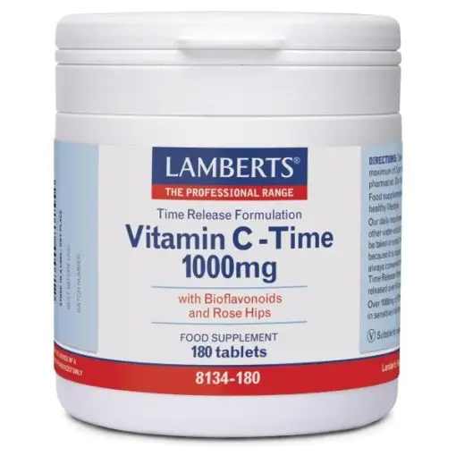 To σκεύασμα Vitamin C Time Release 1000mg της Lamberts παρέχει εγγυημένα 1000mg Βιταμίνης C σε δισκία ελεγχόμενης αποδέσμευσης και μία σημαντική ποσότητα βιοφλαβονοειδών (ρουτίνη, κερσετίνη, κιτρίνη και εσπεριδίνη)τα οποία συμβάλλουν στην απορρόφησή της από τον οργανισμό και σκόνη καρπών αγριοτριανταφυλλιάς (Rose Hips). Όπως όλα τα σκευάσματα της Lamberts, παρασκευάζεται εντός του Ηνωμένου Βασιλείου σύμφωνα με τα αυστηρά πρότυπα της Φαρμακευτικής GMP (Pharmaceutical GMP).