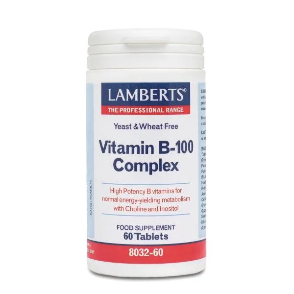 To B-100 Complex της Lamberts αποτελεί μια εξειδικευμένη διατροφική φόρμουλα υψηλής ισχύος που παρέχει το σύνολο των βιταμινών του συμπλέγματος Β. Αρκετές από τις βιταμίνες του συμπλέγματος Β συμβάλλουν: