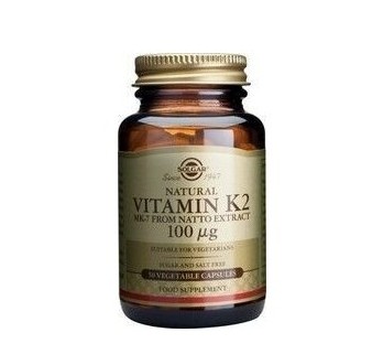 Η SOLGAR Natural vitamin K2 (MK-7) 100 µg χρησιμοποιεί την ιδιαίτερα βιοδιαθέσιμη φυσική μορφή της Βιταμίνης Κ, τη Μενακινόνη-7, γνωστή ανέκαθεν για το σημαντικό ρόλο της στην κατασκευή των οστών και την πήξη του αίματος. Αυτή η μοναδική βιταμίνη Κ προέρχεται από το νατό, μια γιαπωνέζικη τροφή που έχει υποστεί ζύμωση, πλούσια σε βιταμίνη Κ και ιστορικά φημισμένη ως υπερτροφή.